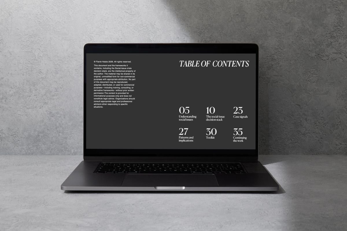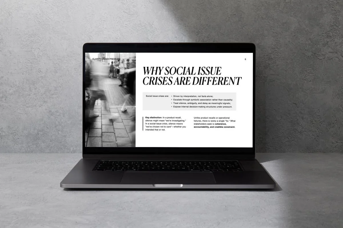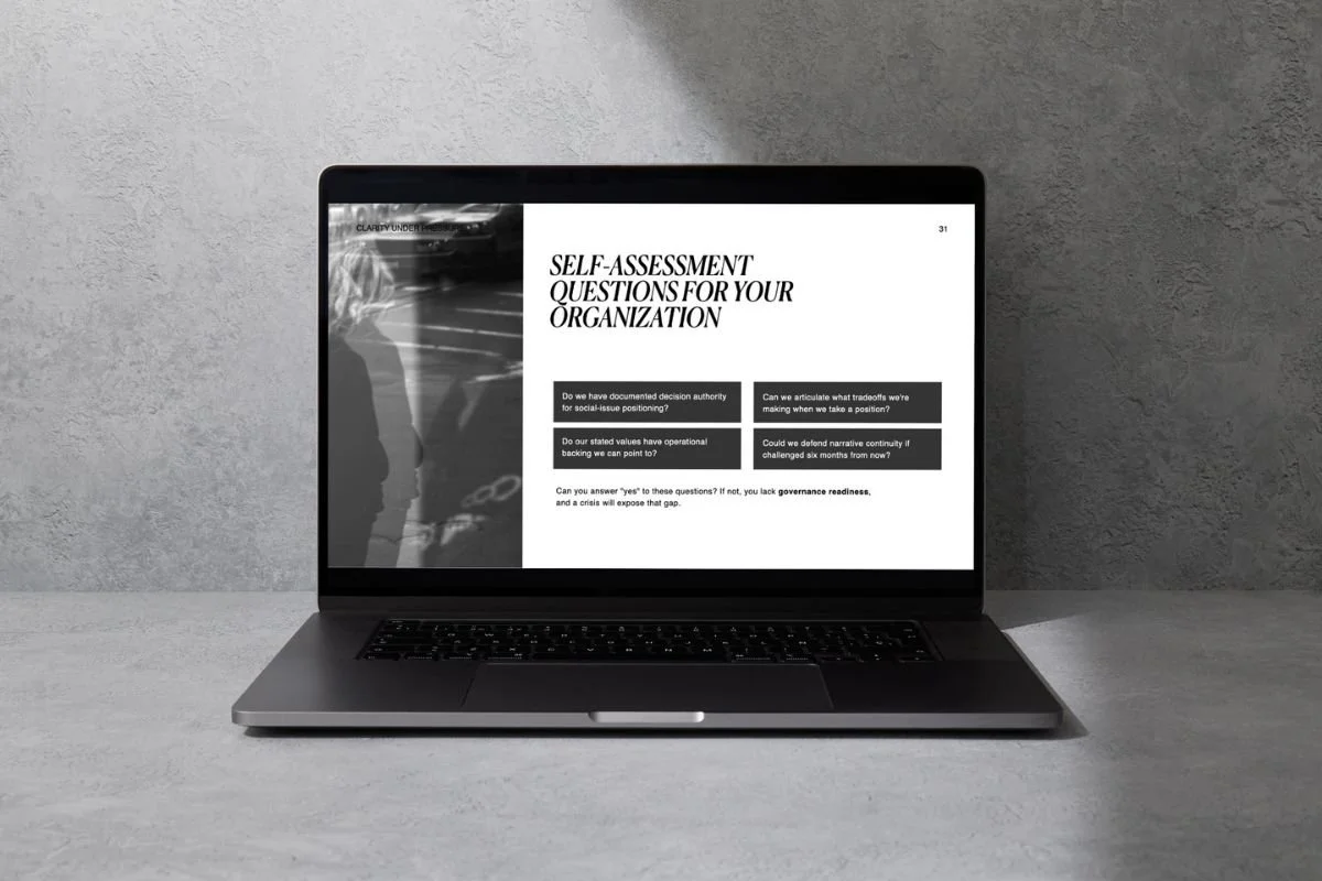 Clarity Under Pressure provides a practical decision framework for navigating social-issue crises when speed, scrutiny, and internal disagreement collide.
